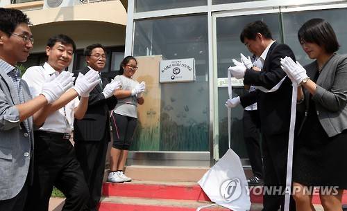 (파주=연합뉴스) 김승두 기자 = '플립러닝'이라는 새 학습모델을 적용한 발명교육 콘텐츠를 활용한 지식재산 이러닝 선도학교로 지정된 파주 갈현초등학교에서 9일 현판식이 열렸다. 박순기 국제지식재산연수원장(오른쪽에서 2번째)과 이상욱 교장(왼쪽에서 3번째), 경기도교육청 전승숙 장학사(맨 오른쪽) 등 관계자가 참석했다. 플립러닝(Flipped Learning) 학습법은 온라인 교육의 효과를 높이기 위한 학습모델로, 학생이 온라인으로 이러닝 콘텐츠를 선행학습한 뒤 오프라인에서 교사가 학생들과 함께 토론식 강의를 진행하는 방식이다.
