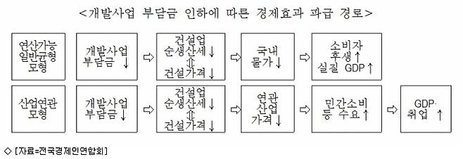 전경련 관계자는 "조세와 중복되는 개발 부담금, 학교용지 부담금 등 2개의 부담금을 폐지하고 정부가 추진 중인 농지보전 부담금, 대체산림자원 조성비, 개발제한구역 보전부담금 등 3개의 부담금의 한시적 감면이 시행될 경우 소비자 후생은 750억원 증가한다"며 "민간 소비가 2천500억원 증가해 최소 4천500 명의 일자리가 창출될 수 있다"고 말했다.