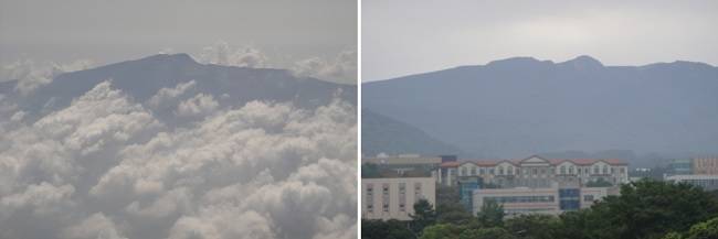 | ▲ 제주도 한라산 백록담입니다. 왼쪽 사진을 비행기에서 떠나올 때 찍은 것이고, 오른쪽은 제주도 서남쪽에서 본 모습입니다. 날씨에 따라서 한라산 백록담이 보이지 않는 때도 있습니다. |