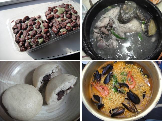 | ▲ 제주도에 맛본 제주도 먹거리입니다. 사진 왼쪽 위부터 잡곡과 팥으로 만든 모메기떡, 전복 삼계탕, 해물 라면, 보리빵 따위입니다. |