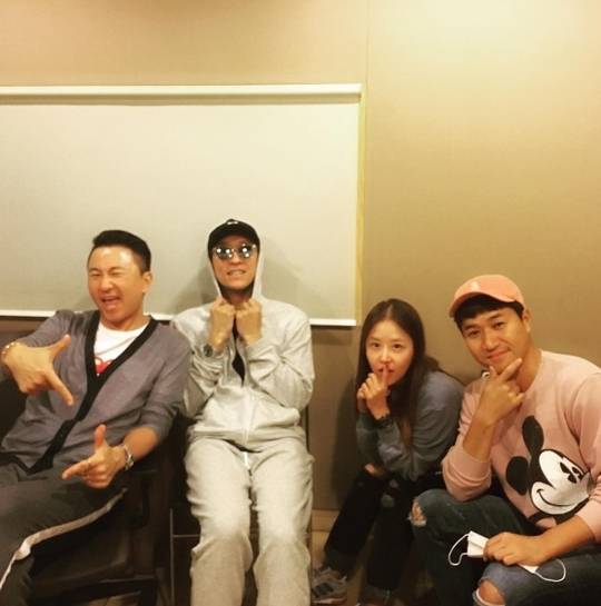 사진에는 주영훈과 코요태 김종민 빽가 신지의 모습이 담겨있다. 네 사람의 화기애애한 모습이 인상적이다.