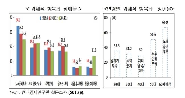 특히 노후준비 부족이라는 답변은 지속적으로 높아지고 있다. 현대경제연구원이 6개월 전 실시한 같은 조사에서 행복의 장애물이 노후준비 부족이라고 응답한 답변은 이보다 5.3%포인트 낮은 28.8%였고, 1년 반 전에는 9.3%포인트 낮은 24.8%에 불과했다.