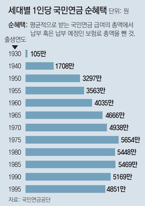 그 결과 1930, 1935년생의 순혜택은 각각 105만 원, 679만 원에 불과했다. 이후 점차 증가해 1950년생은 3297만 원, 1960년생 4035만 원, 1970년생 4938만 원으로 증가하다가 1975년생(5654만 원)에서 정점을 이뤘다. 이후 점차 감소해 1980년생 5448만 원, 1995년생 4851만 원까지 줄었다.