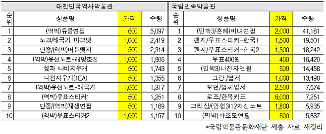 문화상품 판매액 상위 3개 박물관과 대한민국역사박물관에서 판매된 상품 리스트(수량기준)를 보면 국립중앙박물관 판매 1위 품목은 박물관백배즐기기-선사고대(1000원)였다.