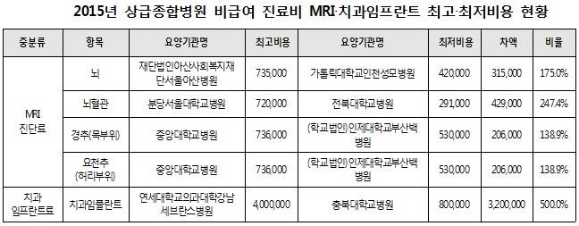 이외에 MRI 진단료는 2015년 뇌, 뇌혈관, 경추, 요천추 각각 많게는 최고와 최저 비급여 진료비 격차가 42만9000원에서 20만6000원까지 차이가 났다. 치과 임프란트는 연세대강남세브란스병원에서 400만원까지 비용을 받았고, 충북대병원은 80만원을 받아 5배의 차이가 나는 것으로 나타났다.