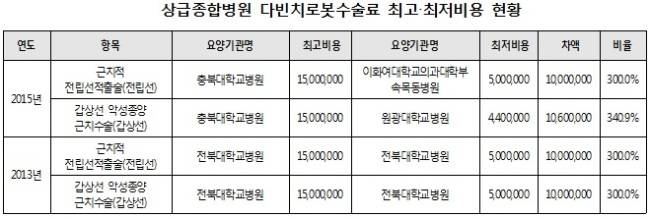 다빈치로봇수술료는 공개된 2개 항목 전립선과 갑상선에 대한 진료비 모두 국립대병원인 충북대병원이 가장 비싼 1500만원이었다. 이에 비해 이대부속 목동병원은 전립선에 대한 다빈치로봇수술료는 500만원으로 충북대병원과 1000만원의 가격차가 있었다.