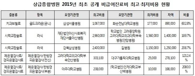 2015년 처음으로 공개된 치과 및 안과 관련 비급여 진료비도 최고와 최저비용간의 격차가 큰 것으로 나타났다. 2015년에 처음공개 된 치과보철료는 삼성서울병원이 106만원이었지만, 화순전남대병원은 17만원에 불과했다. 차액은 89만원으로 6배의 차이가 났다. 시력교정술인 라섹은 강북삼성병원이 240만원을 받았지만, 길병원은 115만원을 받았다.