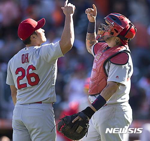 【샌프란시스코=AP/뉴시스】오승환(34·세인트루이스 카디널스)이 19일(한국시간) 미국 캘리포니아주 샌프란시스코의 AT&T 파크에서 열린 2016 메이저리그(MLB) 샌프란시스코 자이언츠와의 경기에서 팀이 3-0으로 앞선 9회말 등판, 1이닝을 무실점으로 막고 팀 승리를 지킨 뒤 포수 야디에르 몰리나와 세리머니를 하고 있다.