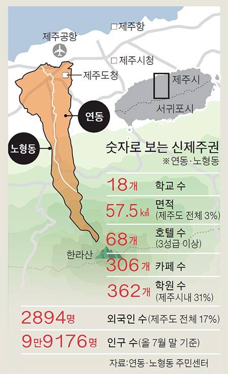 제주대 정수연(경제학과) 교수가 최근 통계청의 인구 데이터를 분석한 결과, 2013년에만 제주도 밖에서 제주로 전입한 2만8244명 가운데 절반이 넘는 1만4991명(53.1%)이 연동과 노형동 일대로 옮겨갔다. 제주 총 인구(65만명)의 15%(9만9176명)가 제주 전체(1848.4㎢)의 3%(57.5㎢) 면적에서 산다. 숙박시설도 잘 갖춰져 3성급 이상 호텔이 연동에 60개, 노형동에 8개가 있다.