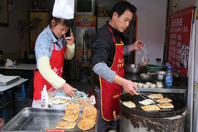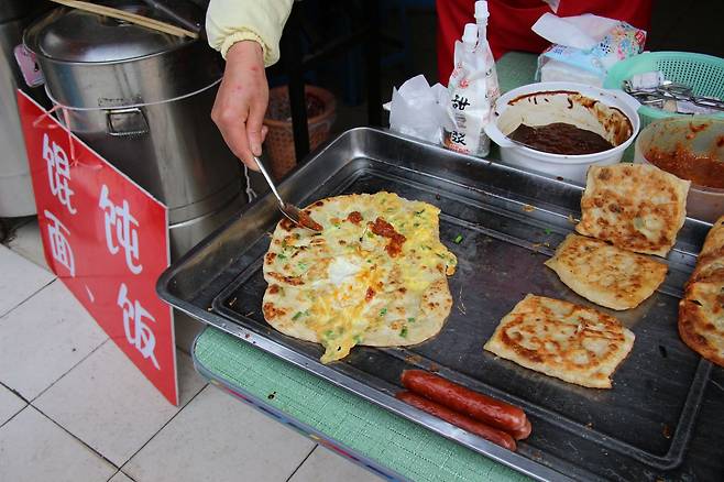 부부가 운영하는 ‘지단총요우빙’ 가게도 있었다. 간단히 지단빙이라고 하는데, 이것도 중국인이 즐겨먹는 아침 메뉴다. 개어놓은 밀가루를 철판에 두르고 계란과 파를 올려 지진 뒤 둘둘 말아준다. 어릴 적 엄마가 해주던 계란 토스트 맛인데, 여기에 매콤한 라장을 뿌리면 훨씬 먹기 좋다.