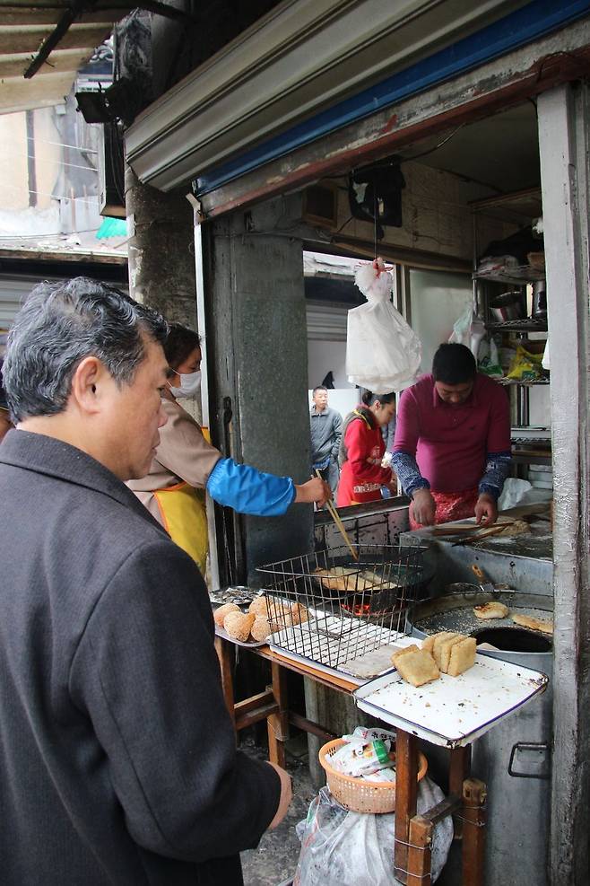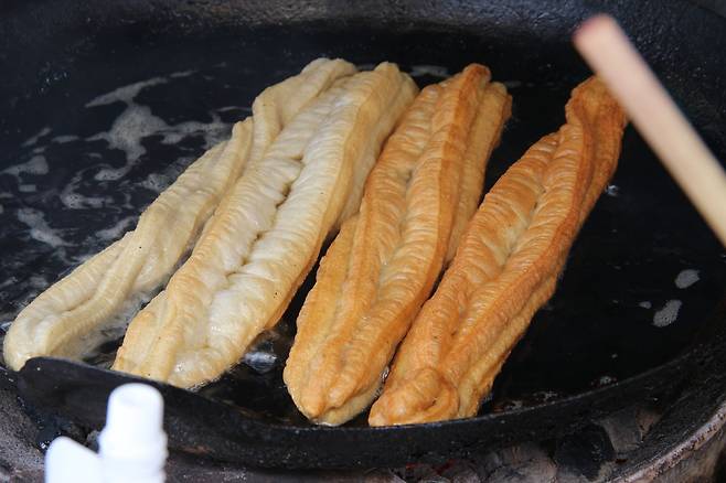 이곳엔 중국식 아침을 파는 식당도 일찌감치 문을 연다. 빈속으로 나온터라 출출해서 모든 음식이 다 맛있어 보였다. 우선 중국인들의 기본적인 아침식사인 ‘요우탸오(油條)’와 달달한 두유 ‘더우장(豆漿)’을 사서 먹었다. 꽈배기처럼 생긴 요유탸오를 한입 먹어보고는 깜짝 놀랐다. 기름에 튀겼는데도 전혀 느끼하지 않았다. 겉은 바삭하고 속은 쫄깃해서 식감이 프랑스 빵 크로와상과 비슷했다. 예전에도 몇 번 먹어봤지만 제대로 만든 요우탸오는 이때 처음 맛봤다.