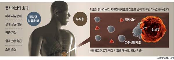 매운맛을 내는 대표성분은 '캡사이신'이다. 캡사이신은 몸 안에 통증수용단백질(TRPV1)과 결합해 통증과 열·땀을 유발시킨다. 그동안 캡사이신은 몸속 지방 분해, 장내 살균 작용, 염증 치료 등 긍정적인 성분으로 알려져 왔다. 하지만 캡사이신도 과도하게 섭취하면 문제가 될 수 있다. 울산의대 의생명과학 김헌식 교수는 "캡사이신 자체가 발암물질은 아니지만 과도하게 섭취하면 암 발생을 높이는 역할을 할 수 있다"고 말했다.