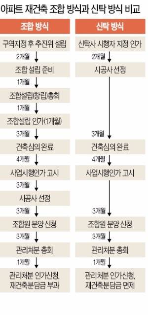 한국자산신탁에 따르면 구역지정 후 추진위원회 설립단계의 재건축 사업장은 조합설립 인가, 건축심의, 사업시행 인가, 시공사 선정, 관리처분 총회, 관리처분 인가 등의 절차를 받기까지 2년가량의 시간이 소요된다. 하지만 신탁 방식을 통하면 관리처분 인가를 받기까지 1년4개월이면 충분하다. 신탁사 시행자 지정 인가가 나면 조합 설립 없이 곧바로 시공사 선정과 건축심의를 동시에 할 수 있어서다.
