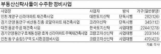 정비사업 전담조직인 조합사업본부를 설치한 코리아신탁도 경기 안양시 동안구 비산동 진흥·로얄아파트 재건축사업의 단독 시행자로 선정됐다. 이 단지는 작년 12월 정비구역으로 지정됐다. 코리아신탁은 조합이 없는 상황에서 토지 등 소유자의 동의를 얻어 이 사업을 수주했다.