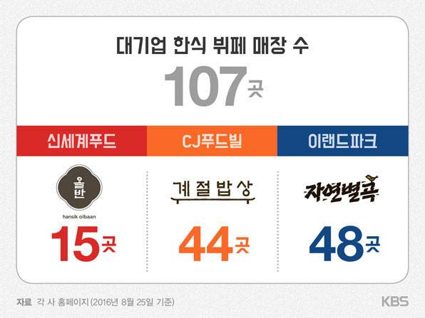 2천년대 들어 대기업이 운영하는 식당들이 빠른 속도로 늘어나자 지난 2013년 동반성장위원회는 음식점업을 중소기업 적합업종으로 지정했습니다. 이에 따라 대기업들은 자신들이 운영하는 식당을 더 확장하지 말 것을 권고받았습니다. 동반위는 권고기간이 끝난 음식점업에 대해 2016년 5월 중소기업 적합업종으로 다시 지정했습니다. 중소 상인들이 여전히 대기업과 경쟁할 여건이 안 된다고 판단했기 때문인데, CJ푸드빌의 경우 지난 8월에도 한식뷔페 매장을 새로 열었습니다.