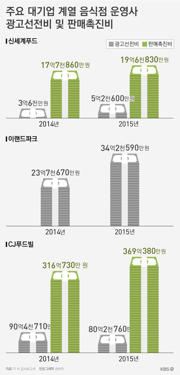 다른 한식뷔페 자연별곡을 운영하는 기업 이랜드파크는 지난해 광고선전비로 34억2천590만 원을 썼는데요. 이는 2014년보다 44% 늘어난 금액입니다. 역시 한식뷔페 올반을 운영하는 기업 신세계푸드는 지난해 광고선전비와 판매촉진비로 24억9천630만 원을 썼습니다. 이 또한 전년대비 16.6% 늘었습니다.