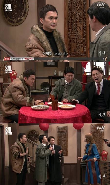 장현성은 이후 영화 '밀정' 콩트를 소화했다. 장현성이 배우 이병헌으로 분해 콩트를 펼친 가운데 '밀정'에서 화제를 모은 삼자대면 음주 신을 패러디해 폭소를 안겼다. 걸그룹 라붐의 솔빈도 깜짝 출연해 눈길을 끌었다.