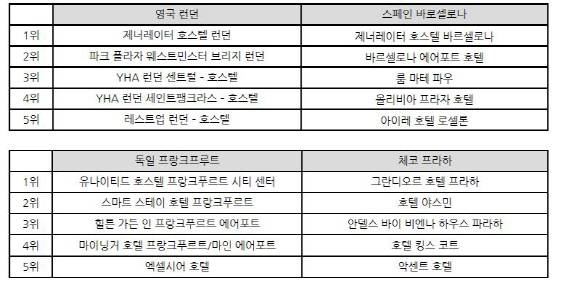 익스피디아의 발표 내용을 보면 영국 런던 지역에서는 ‘제네레이터 호스텔 런던’이 1위를 차지했으며 스페인 파로셀로나에서도 ‘제너레이터 호스텔’이 1위의 영예를 안았다. 체코 프라하에서는 ‘그란디오르 호텔 프라하’가, 독일 프랑크프루트에선 ‘유나이티드 호스텔 프랑크푸르트 시티 센터’가 한국여행자들이 찾는 최다 숙박시설로 이름을 올렸다.