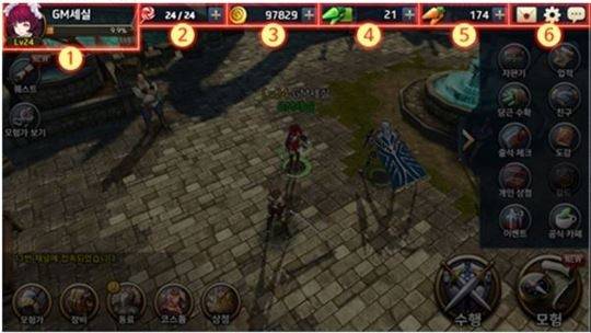 화면 구성 또한 깔끔해 상단에서 모험가 레벨과 경험치, 보유하고 있는 각종 재화를 확인할 수 있으며 이 외에도 우편함, 설정, 채팅 기능을 이용할 수 있다. 화면 우측에는 공식카페와 이벤트, 출석체크 등 전투 외 콘텐츠를 이용할 수 있다. 화면 좌측과 하단에서는 퀘스트, 동료 관리, 장비, 상점 등의 기능을 제공한다.