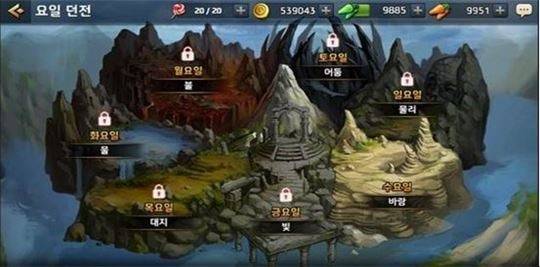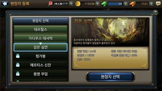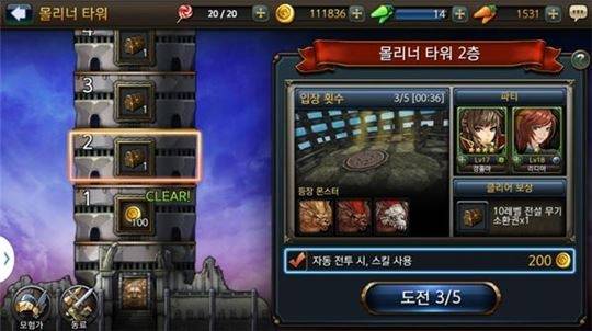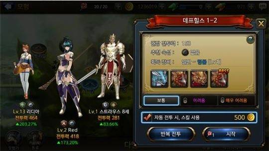 화면 우측의 정보창을 통해 해당 스테이지를 공략하기 위한 추천 속성과 권장 전투력 등의 정보를 확인할 수 있고 획득 장비와 등장 몬스터도 미리 파악할 수 있다. 난이도는 보통, 어려움, 매우 어려움 세 가지로 나뉘어져 있으며 최대 20회까지 반복 전투도 지원한다.