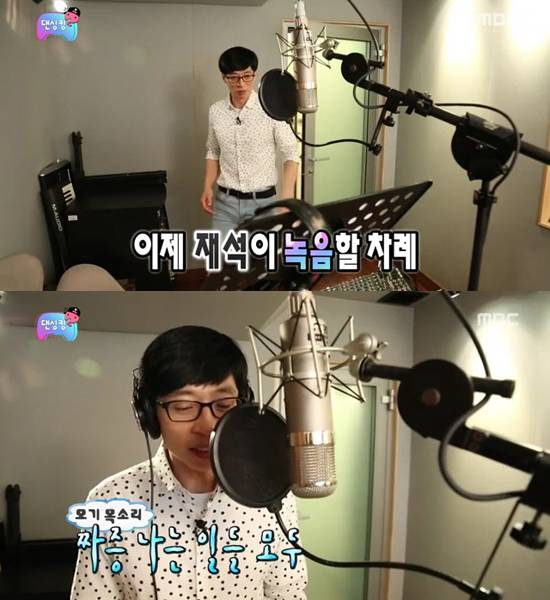 | ▲ <무한도전>'댄싱킹' 방영분. '댄싱킹' 녹음에 사용된 마이크는 거꾸로 매달려 있음을 알 수 있다. |