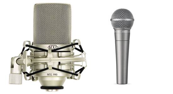 | ▲ 녹음실에서 흔히 사용되는 콘덴서 마이크 (왼쪽)와 공연 및 각종 활동에 두루 쓰이는 다이내믹 마이크 |