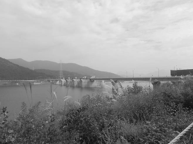 | ▲ 합천보 관리사무소를 바라보며 곽상수 이장과 "보 철거"를 외쳤다. 뒤편에 합천보가 보인다. |