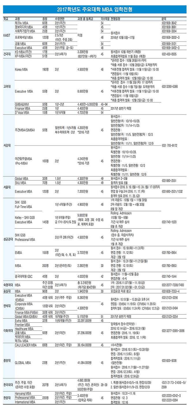 ◆ 한국형MBA / 2017학년도 주요대학 MBA 입학전형◆