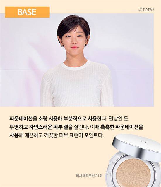 SKIN 박소담 본연의 좋은 피부 결을 살리기 위해 파운데이션을 소량 사용해 부분적으로 사용한다. 민낯인 듯 투명하고 자연스러운 피부 결을 살린다. 이때 촉촉한 파운데이션을 사용해 매끈하고 깨끗한 피부 표현이 포인트다.