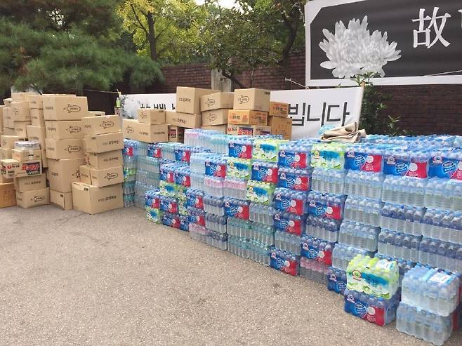물품은 장례식장 건물 1층 입구에 있는 '밥차' 천막으로 배송됐다. 장례식장을 찾는 이들에게 식사를 제공하기 위해 설치된 '밥차'는 백씨가 사망한 지난 25일부터 꾸준히 운영되고 있다.