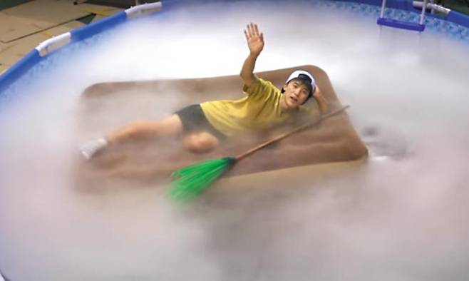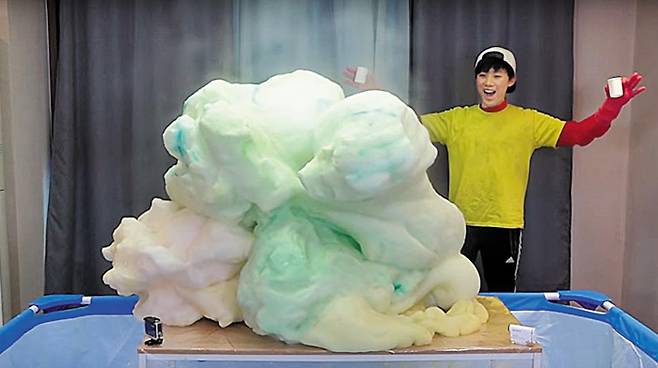 노란 티셔츠를 입은 청년이 거대한 튜브식 실내 수영장에 슬라임 가루(slime powder·점액질을 만들어내는 가루) 100봉지를 마구 쏟아 붓는다. 물을 잔뜩 넣고는 그 속으로 점프해서 휘적휘적 헤엄친다. 몸을 움직일 때마다 가루와 물이 섞이고 금세 물이 끈끈해진다. 수영장 물이 젤리처럼 변한다. 청년이 외친다. "으악, 액체 괴물이 완성됐다!"