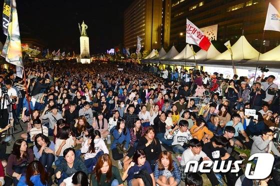 (서울=뉴스1) 민경석 기자 = 1일 오후 서울 종로구 광화문광장 남측 세월호 농성장에서 열린 '세월호 900일 문화제'에서 시민들이 세월호 참사 진상규명을 요구하며 구호를 외치고 있다. 2016.10.1/뉴스1