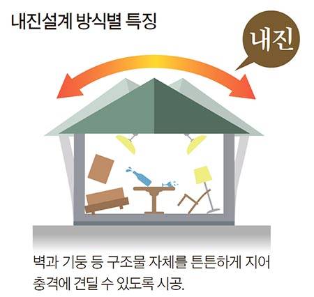 이미 지어진 건물에서 지진 성능을 보강한다면 가장 일반적인 방법은 내진설계 방식이다. 벽을 더 두껍게 보강하거나 철판으로 된 벽체를 추가로 세우는 것이다. 아웃리거, 벨트트러스, X자 브레이스 등을 설치하는 방법도 있다. 내진 보강 사례는 주로 리모델링을 하는 아파트에서 많이 나온다. 리모델링 아파트도 내진설계 의무규정 대상이기 때문이다. 건설업계에 따르면 리모델링 과정에서 지금 기준의 내진 설비를 갖추는 데 3.3㎡당 15만~20만원 정도의 추가 비용이 나온다.