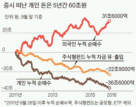 개인 엑소더스..증시 떠난 돈 5년 간 60조원