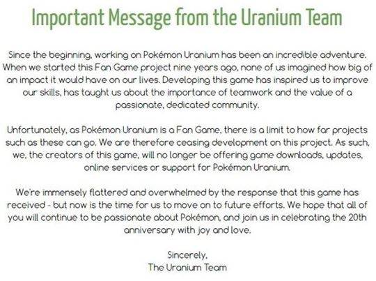 닌텐도의 요청으로 배포가 중단된 팬게임 '포켓몬우라늄'(okemon Uranium)의 개발진이 배포 중지 한 달여만에 SNS를 통해 심경을 고백했다. 이들은 개발 기간 동안 멋진 모험을 했다며 닌텐도의 결정을 존중하는 모습을 보였다.