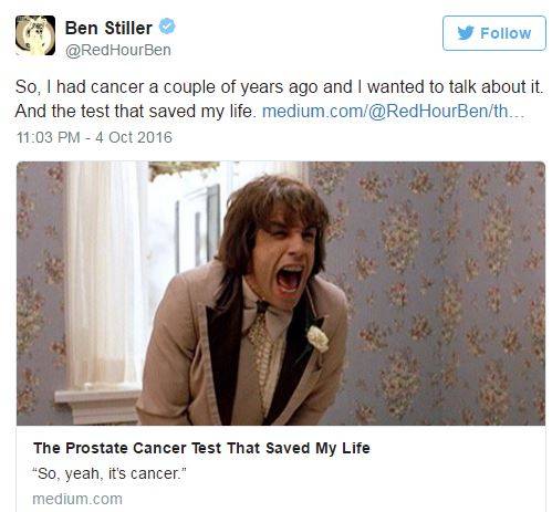 벤 스틸러는 “(전립선암이) 어느날 갑자기 찾아왔다”라며 “아무 생각이 없었다”라고 전했다.