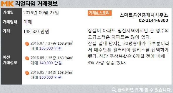 7일 부동산 업계에 따르면 스마트공인중개사는 지난달 27일 송파구 갤러리아팰리스아파트 전용면적 163.94㎡(약 49.6평) 25층 매물을 14억8500만원에 매매 계약했다. 국토교통부 실거래자료를 기준으로 가장 최근 거래 건은 2016년 7월에 신고 된 37층 매매가 16억5000만원이다.