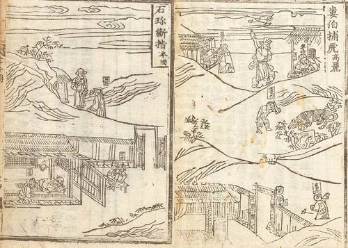 | 아버지를 잡아 먹은 호랑이를 잡아 뱃속을 가르고, 장례를 치렀다는 일화를 소개한 ‘누백포호’를 묘사한 삼강행실도의 그림. |