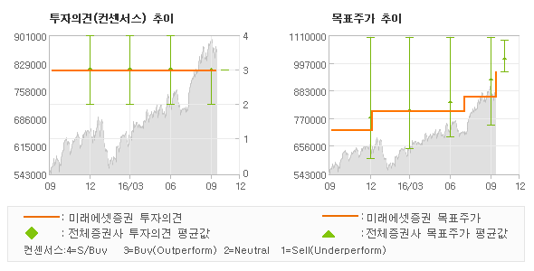 | 오늘 미래에셋증권에서 발표된 '매수'의견 및 목표주가 960,000원은 전체 컨센서스 대비해서 대체적으로 평균치에 해당하는 수준으로, 이번 의견은 동종목에 대한 전체적인 흐름에서 크게 벗어나지 않은 것으로 파악되며 목표가평균 대비 4.1%정도 미달하고 있는 것으로 집계되었다. 참고로 최근에 목표주가를 가장 공격적으로 제시한 이베스트투자증권에서 투자의견 '매수(유지)'에 목표주가 1,100,000원을 제일 보수적인 의견을 제시한 KTB투자증권에서 투자의견 '매수'에 목표주가 870,000원을 제시한 바 있다. |