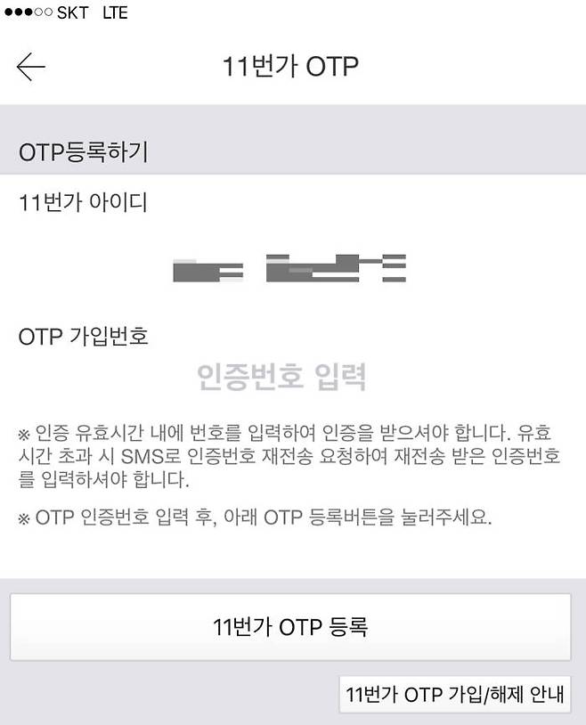 11번가 OTP 인증번호는 은행에서 발급하는 일회용 비밀번호 생성기처럼 매번 바뀐다. 5회 이상 인증에 실패하면 자동으로 계정 접근을 차단한다.