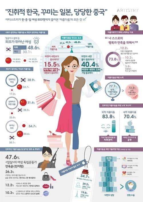 설문조사 결과에 따르면 한·중·일 여성들은 대체적으로 외면과 내면의 조화로운 아름다움을 의미하는 '진취적인 아름다움'의 가치를 매우 중요하게 인식하고 있으며, 타인의 시선보다 스스로의 만족을 위해 아름다움을 추구하는 경향이 높은 것으로 나타났다.