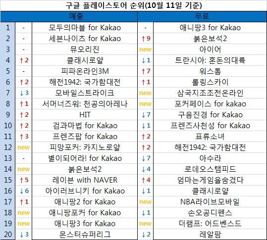 ◆구글 매출 순위-'애니팡' 3형제 선전