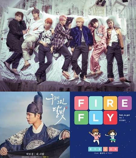 [스포츠서울 서장원기자] 그룹 방탄소년단의 정규 2집 타이틀곡 '피 땀 눈물'이 주요 음원차트에서 1위를 기록 중인 가운데 박보검의 '내 사람', 황치열과 은하가 함께 부른 '반딧불이' 등 신곡들의 기세가 무섭다.