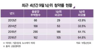 부동산시장 분석업체 부동산인포가 아파트(임대주택 제외) 기준으로 2013년 이후 매년 9월 청약 결과를 분석한 결과 지난달 전국에서 분양된 총 162개 주택형 중 64.8%인 105개 주택형이 1순위에서 청약 마감됐다. 청약 열기가 더 뜨거웠던 지난해 9월의 1순위 마감률(64.1%)보다 높은 수치다. 하지만 1순위 마감 증가에도 미달률은 오히려 더 늘었다. 청약 결과 분석에 따르면 8·25 대책 이후 미달률은 더 증가하고 2순위 마감은 줄어 청약시장 양극화는 더욱 심화된 것으로 파악됐다.