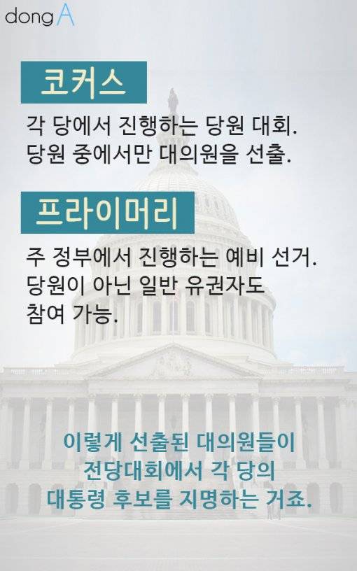 힐러리 클린턴 민주당 대선 후보와 도널드 트럼프 공화당 대선 후보는 박빙의 지지율을 보이고 있어 누가 승리할 것인지 점치기 쉽지 않다. 두 후보의 치열한 경쟁 뒤에는 미국의 대선 제도가 자리 잡고 있다. 복잡한 구조와 일정을 가진 미국의 대통령 선거 제도에 대해 알아보자.