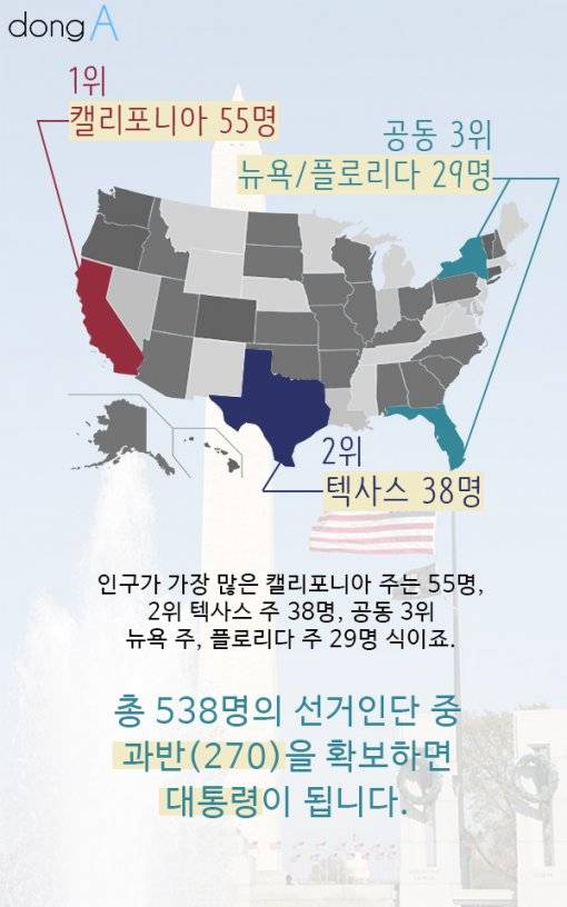 ◇ 투표 방식 미 대선은 각 주 당 인구비례에 따라 배정되어 있는 총 538명의 선거인단(electoral college)이 대통령을 선출하는 승자독식제(winner-takes-it-all)로 간접선거 방식이다. 후보는 선거인단 기준으로 과반인 270명만 확보하면 이기는 게임이다.