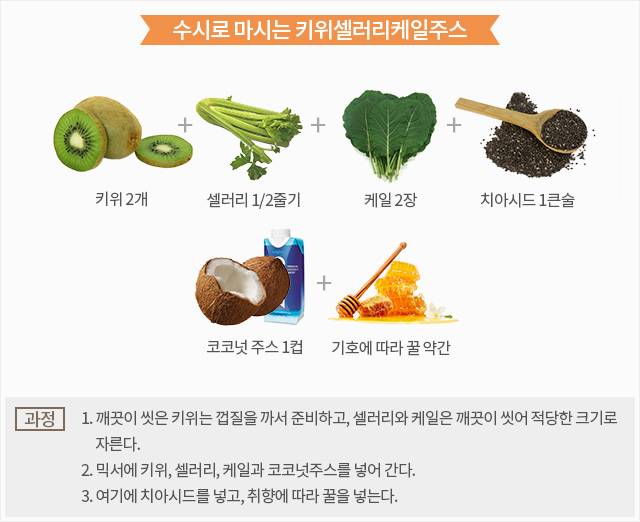 먼저, 수시로 마시는 키위셀러리케일주스는 녹색 채소류를 기본으로 하고, 치아시드가 들어간다. 남아메리카 지역의 완전식품*으로 불리는 치아시드는 1큰술에 우유 한 잔과 맞먹는 칼슘(우유 200㎖ 기준으로 칼슘 210㎎ 정도 함유)이 들어 있다. 또, 식이섬유와 단백질은 각각 백미의 39배, 2.6배(치아시드 100g 속 식이섬유 38g, 단백질 16g 함유)가 들어 있다. 물에 닿으면 10배 정도 부풀어 올라 적은 양으로 쉽게 포만감을 느끼는 것도 장점이다.