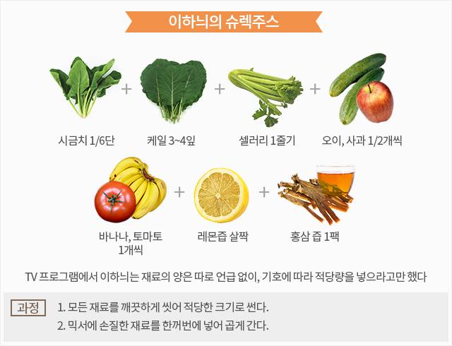해독 주스에 들어가는 채소는 위·소장·대장의 연동운동을 촉진하는 양배추와 마그네슘(Magnesium)이 들어 있어 생리 불순에 도움을 주는 브로콜리, 그리고 붉은 색소 리코펜(Lycopene)이 많이 함유돼 있어 탄력을 유지하는 데 도움을 주는 토마토다. 과일은 사과와 바나나를 넣는데, 사과는 혈액에 산소를 운반하는 헤모글로빈(Hemoglobin)과 비타민C가 풍부해 피부를 맑게 해주고, 바나나는 몸속 나트륨을 배출시키는 칼륨이 풍부하다.