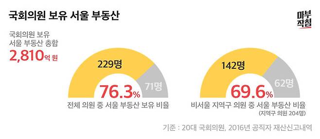 의원들의 부동산 재산 중 눈여겨 볼 대목은 서울 소재 부동산(토지+건물)이다. 서울에 지역구를 둔 의원 49명, 비례대표 47명을 포함해도 100명을 넘지 않지만, 20대 국회의원 300명 중 76.3%인 229명이 서울에 부동산을 가지고 있다. 이들이 가진 서울 부동산 재산을 합치면 2,810억 원에 이른다. 특히, 지역구가 서울이 아닌 의원(비례대표 제외) 204명 중 142명(69.6%)가 서울에 부동산을 가지고 있는 것으로 나타났다.