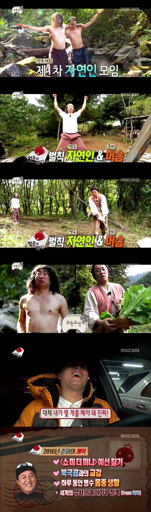 지난 15일 방송된 ‘무한도전’의 500회 특집인 ‘무도리 GO’ 방송 말미에는 오는 22일 전파를 탈 행운의 편지 벌칙 수행 특집이 살짝 공개됐다. 바로 자연인 박명수와 머슴 정준하의 숲속 생활이 펼쳐지는 것. 앞서 지난 1월 23일 방송된 ‘행운의 편지’ 특집은 ‘무한도전’의 올 한 해 웃음거리의 원천이 되고 있다.